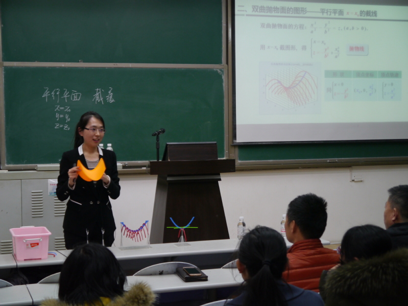 储继迅以《高等数学》课程中的“二次曲面之双曲抛物面”节段为例进行了一堂课堂教学展示。她讲述条理清楚、重点突出,教态仪表自然得体、落落大方,授课内容环环相扣、设计巧妙,通过精心制作的数学教具、别出心裁的案例选择和形象生动的动画模拟,使枯燥乏味的数学问题变得通俗易懂、生动有趣,充分展示了“数学之美”和国赛一等奖获奖选手的风采。储继迅还以“曲率”课程为例,为大家介绍了教学设计的方法与技巧,突出了素材准备、知识引入、过程构建、科研前沿以及指导团队在课程教学设计中发挥的重要作用。最后,储继迅与现场教师进行了互动和交流,为即将参赛的青年教师提出了宝贵的意见和建议。