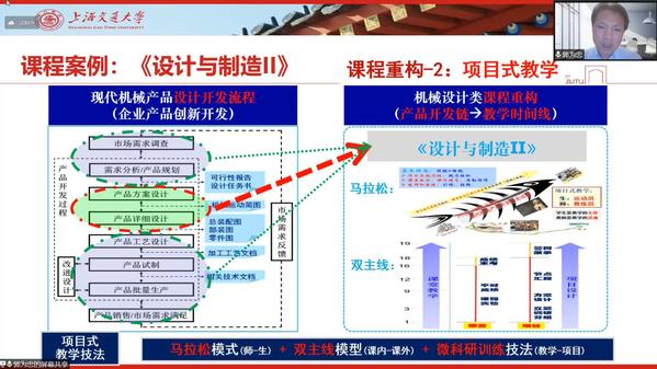 郭为忠从课堂教学改革的背景、以研促教的教学设计、三点合一的思政设计、专业课程的教学实践四个方面,系统地介绍了新工科基础课《设计与制造II》的教学改革实践经验。郭为忠形象地将课程建设的三要素比作精湛烹饪的三过程,即准备与时俱进的课程知识体系作为“优质食材”,放入“三点合一”思政元素体系作为“精致调料”,结合融入式教学的课堂教学方法进行“烹饪”,从而打造符合“两性一度”要求、浸润着思政育人元素的一流金课。郭为忠认为,科教融合的有效途径是融入课程、融入科创指导,应从产品单元和系统视角重构课程知识体系,形成层次化的知识点和能力点清单,并采用“马拉松模式+双主线模型+微科研训练技法”的项目式教学方法,同时结合“全过程、全要素”的综合评价方式,激发学生的内生动力、调动学生的创新潜能。郭为忠指出,要围绕课程教学的定位、内容、模式、方法、资源、工具六个方面进行思政融入点和育人方法的梳理、挖掘,最终形成专业课程的全环节、全过程、分布式、融入式的思政元素体系,将思政育人元素自然、无痕地融入课程教学过程,做到知识点、能力点、思政点“三点合一”,从而实现全方位课程思政育人。报告最后,郭为忠还就老师们提出的问题进行了深入交流和探讨。